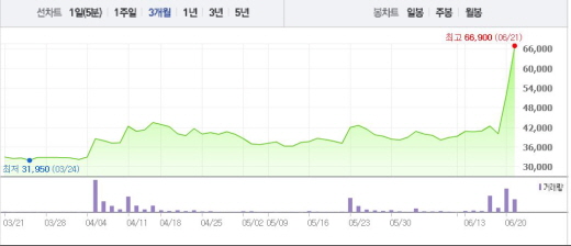 부산산업은 21일 오전 9시21분 현재 전일 대비 28.39%(1만5100원) 상승한 6만7200원에 거래되고 있다. 부산산업은 20일에도 외국인이 매수에 나서면서 가격제한폭인 29.93%의 상승폭을 기록했다.