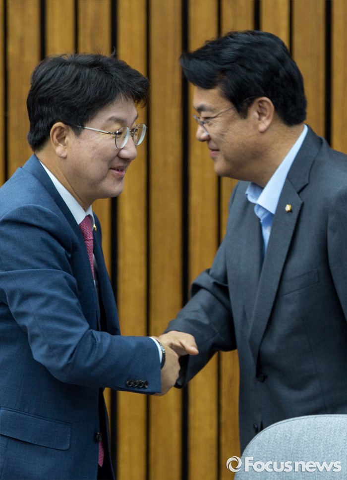 (서울=포커스뉴스) 정진석 새누리당 원내대표와 권성동 사무총장이 21일 오전 서울 여의도 국회에서 열린 원내대책회의에 참석해 악수 하고 있다.