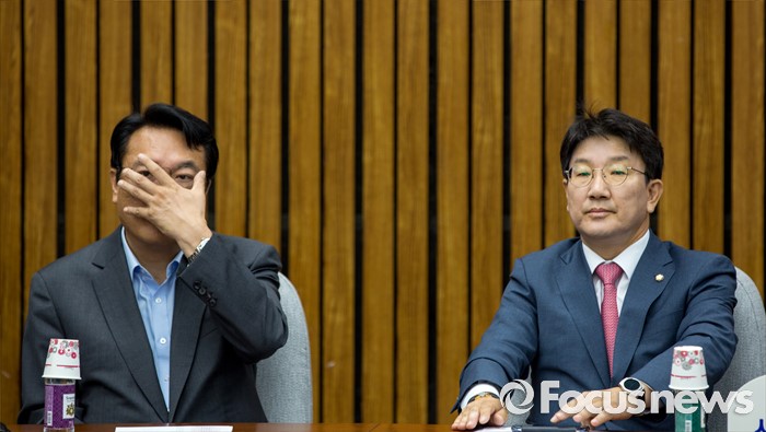 (서울=포커스뉴스) 정진석 새누리당 원내대표와 권성동 사무총장이 21일 오전 서울 여의도 국회에서 열린 원내대책회의에 참석하고 있다.