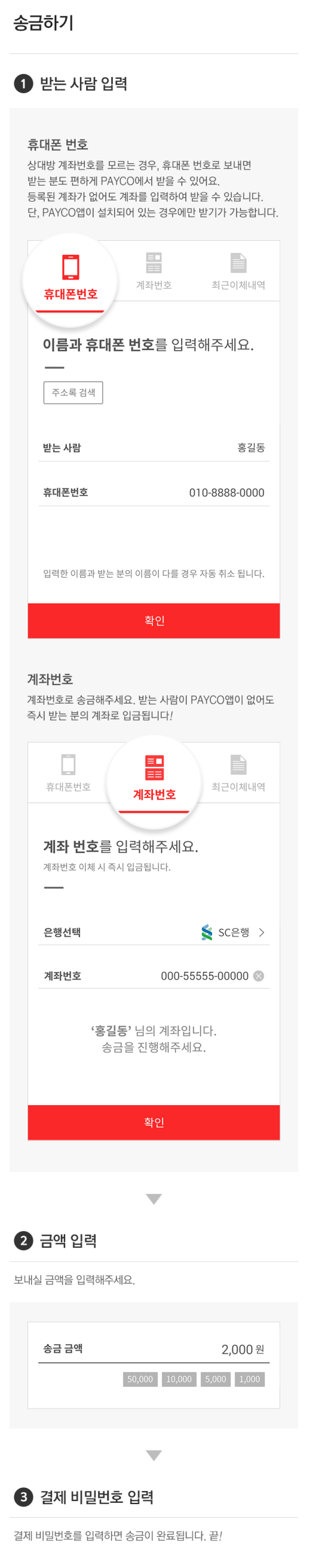 NHN엔터테인먼트 김동욱 페이코사업본부장은 "온·오프라인의 간편결제가 생활화되고 있지만 송금 서비스의 경우 여전히 인증서나 수수료, 금액 충전 등 번거로운 절차들이 필요했다"며 "페이코는 이러한 복잡한 과정을 줄이면서도 강력한 보안 시스템을 적용, 송금을 하는 사람과 받는 사람 모두가 편하고 안전하게 이용할 수 있다"고 밝혔다.페이코 송금 사용방법 <사진제공=NHN엔터>