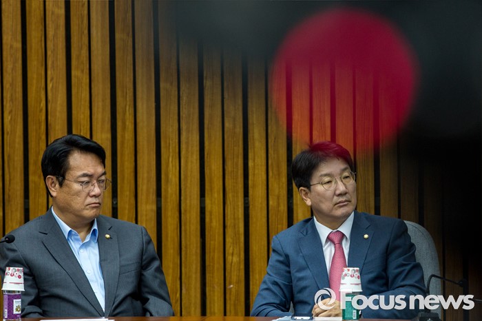 (서울=포커스뉴스) 정진석 새누리당 원내대표와 권성동 사무총장이 21일 오전 서울 여의도 국회에서 열린 원내대책회의에 참석하고 있다.