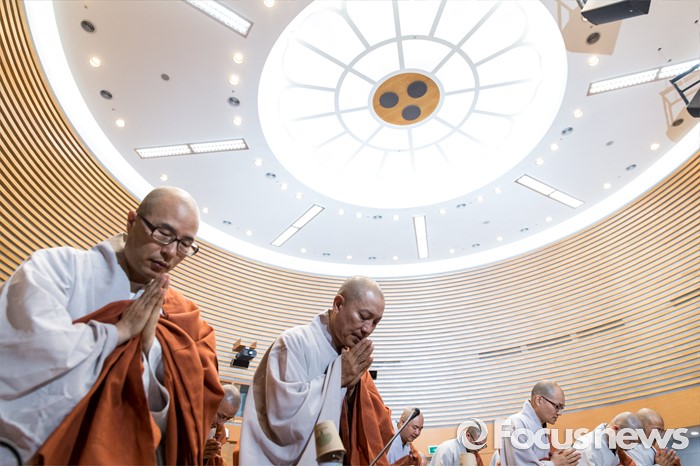 (서울=포커스뉴스) 21일 오전 서울 종로구 한국불교역사문화기념관에서 열린 제206회 조계종 중앙종회 임시회의에서 중앙종회의원들이 삼귀의 반야심경을 봉독하고 있다. 이번 중앙종회 임시회에서는 총무원장 선출제도를 집중적으로 다룰 예정이다.