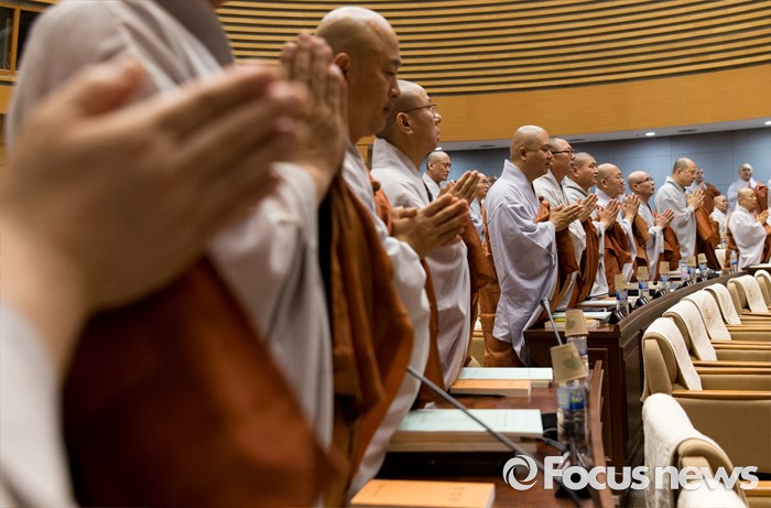 (서울=포커스뉴스) 21일 오전 서울 종로구 한국불교역사문화기념관에서 열린 제206회 조계종 중앙종회 임시회의에서 중앙종회의원들이 삼귀의 반야심경을 봉독하고 있다. 이번 중앙종회 임시회에서는 총무원장 선출제도를 집중적으로 다룰 예정이다.