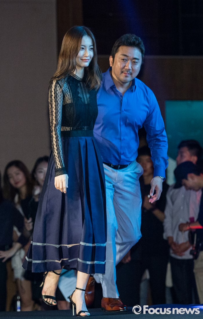 (서울=포커스뉴스) 21일 오전 서울 종로구 나인트리컨벤션에서 열린 영화 '부산행' 제작보고회에 참석한 배우 정유미(왼쪽)와 마동석이 자리를 향해 이동하고 있다.