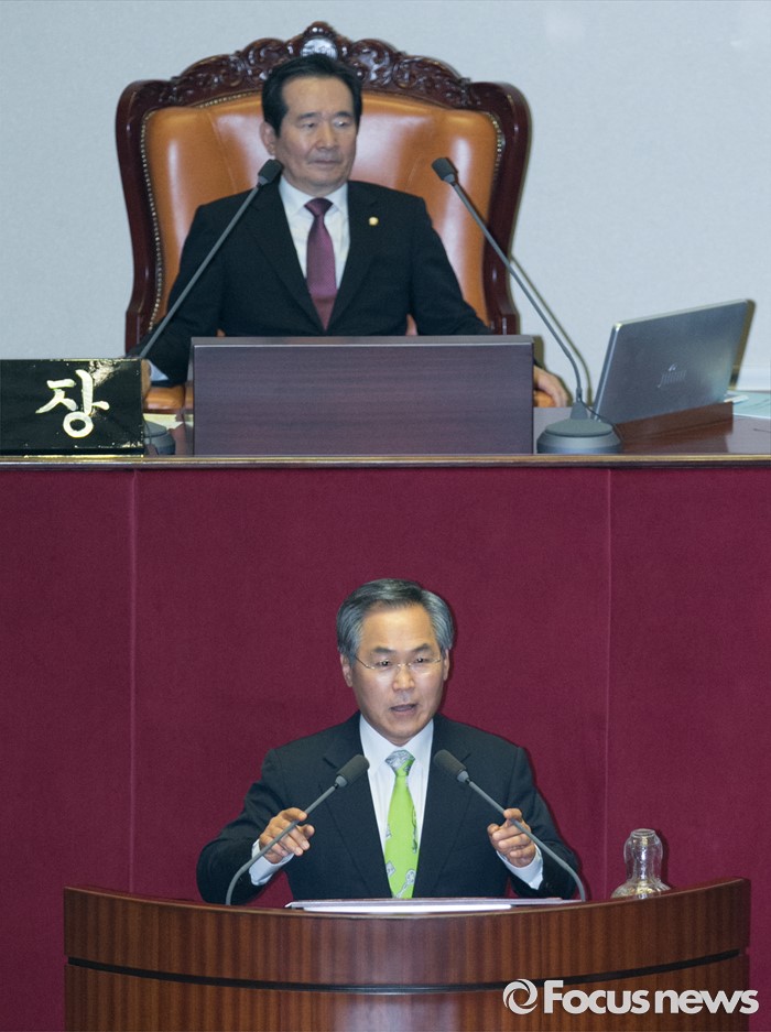 (서울=포커스뉴스) 21일 오전 서울 여의도 국회에서 열린 343회 국회(임시회) 4차 본회의에 참석한 우윤근 신임 국회 사무총장이 인사말을 하고 있다.