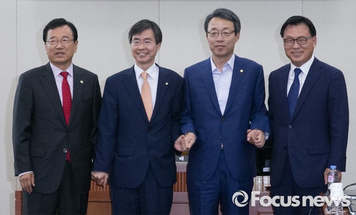 (서울=포커스뉴스) 21일 오전 서울 여의도 국회에서 기획재정위원회 전체회의를 마친 뒤 조경태 위원장 3당 간사가 취재진을 향해 포즈를 취하고 있다. 왼쪽부터 이현재 새누리당 간사, 조 위원장, 김성식 국민의당 간사, 박광온 더불어민주당 간사.