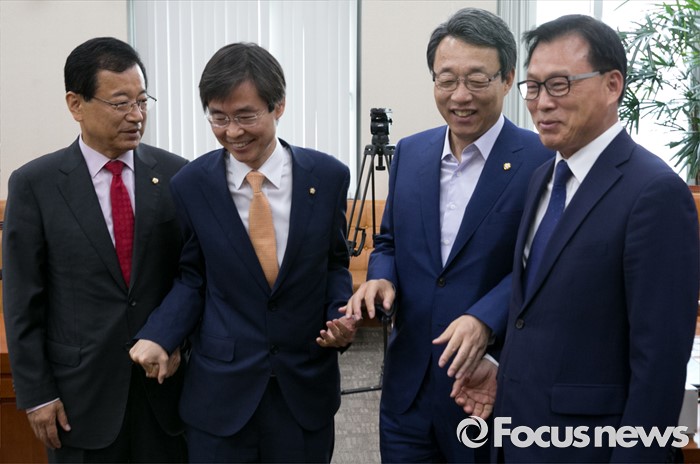 (서울=포커스뉴스) 21일 오전 서울 여의도 국회에서 기획재정위원회 전체회의를 마친 뒤 조경태 위원장 3당 간사가 취재진을 향해 포즈를 취하고 있다. 왼쪽부터 이현재 새누리당 간사, 조 위원장, 김성식 국민의당 간사, 박광온 더불어민주당 간사.