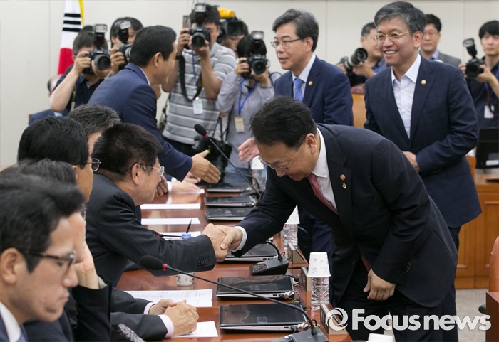 (서울=포커스뉴스) 21일 오전 서울 여의도 국회에서 열린 기획재정위원회 전체회의에 참석한 유일호 경제부총리 겸 기획재정부 장관이 의원들과 인사하고 있다.