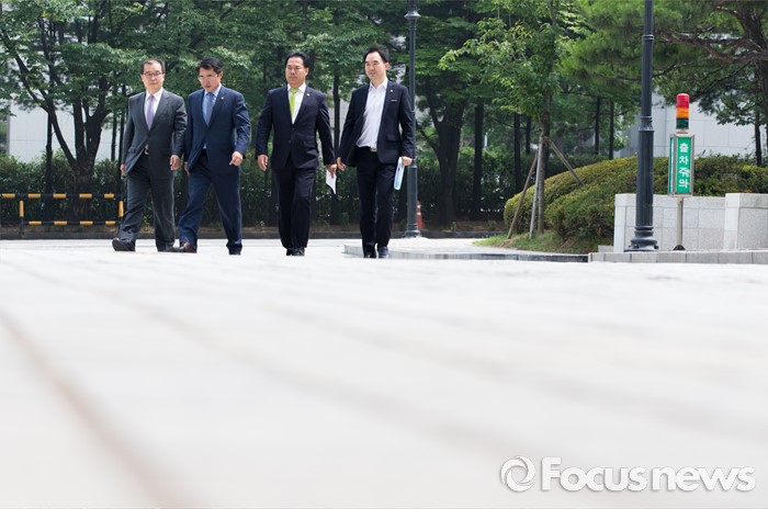 (서울=포커스뉴스) 21일 오후 서울 서초구 대검찰청에서 이용주(오른쪽 두번째) 국민의당 의원이 어버이연합 등 불법자금지원 의혹 규명 진상조사 특별팀(TF)의 항의방문을 위해 대검으로 들어서고 있다. 왼쪽부터 이건태 국민의당, 최경환 의원, 이용주 의원, 채이배 의원.