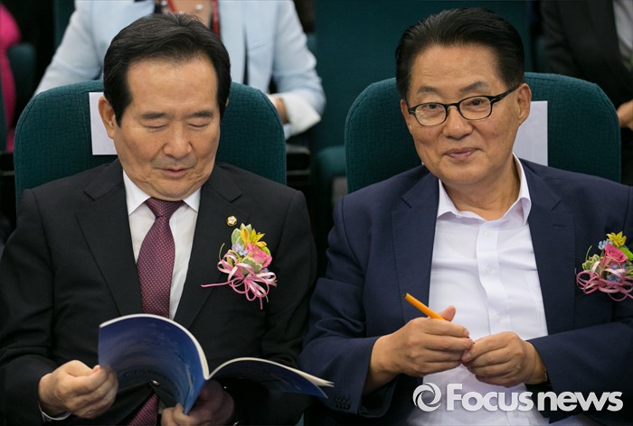 (서울=포커스뉴스) 21일 오후 서울 여의도 국회도서관에서 열린 사단법인 한국여성정치연맹 창립 25주년 기념 토론회에 참석한 정세균(왼쪽) 국회의장과 박지원 국민의당 원내대표가 대화하고 있다.
