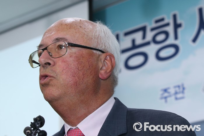 (세종=포커스뉴스) 장 마리 슈발리에 프랑스 파리공항공단자회사 ADPi 수석엔지니어가 21일 오후 세종시 정부세종청사 국토교통부 브리핑실에서 열린 동남권 신공항 타당성 검토 연구 최종 보고회에서 입지선정 결과를 발표하고 있다.