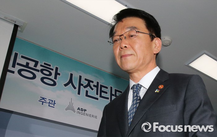 (세종=포커스뉴스) 강호인 국토교통부장과이 21일 오후 세종시 정부세종청사 국토교통부 브리핑실에서 열린 동남권 신공항 타당성 검토 연구 최종 보고회에서 입지선정 결과에 따른 정부입장 발표를 마치고 회견장을 나서고 있다.