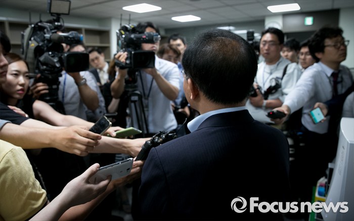 (서울=포커스뉴스) 윤재옥 새누리당 의원이 21일 오후 서울 여의도 국회 의원회관 사무실에서 대구 지역 의원들과 모임을 갖고 영남권 신공항 결과 발표를 지켜본 뒤 취재진 질문에 답하고 있다.