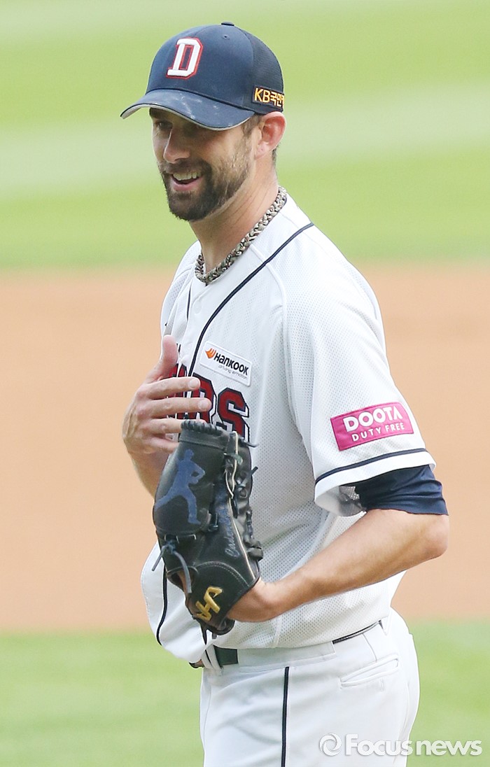 (서울=포커스뉴스) 21일 서울 잠실구장에서 열린 2016 프로야구 kt-두산 경기에서 1회초 두산 선발투수 니퍼트가 밝은 표정으로 사인을 교환하고 있다.
