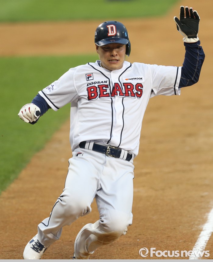 (서울=포커스뉴스) 12일 서울 잠실구장에서 열린 2016 프로야구 kt-두산 경기 3회말 2사 1,2루에서 두산 2루주자 민병헌이 허경민의 좌전 안타떄 홈에서 슬라이딩하며 세이프되고 있다.