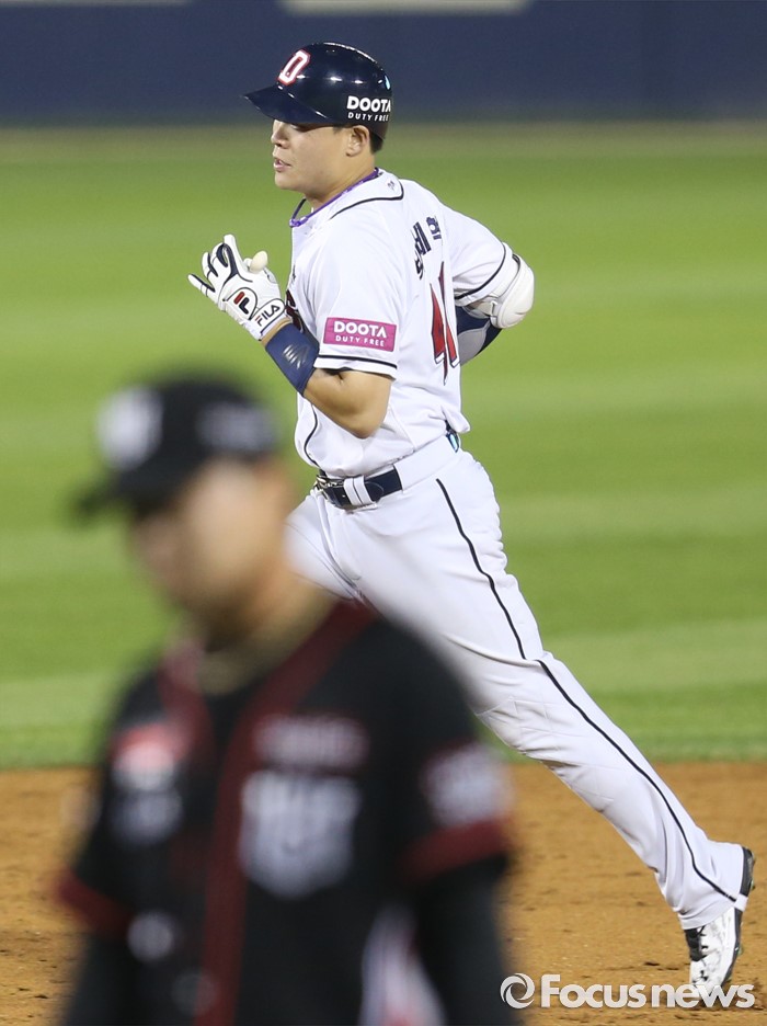 (서울=포커스뉴스) 12일 서울 잠실구장에서 열린 2016 프로야구 kt-두산 경기 4회말 2사 1루에서 두산 박세혁이 우월 2점 홈런을 치고 그라운드를 달리고 있다.