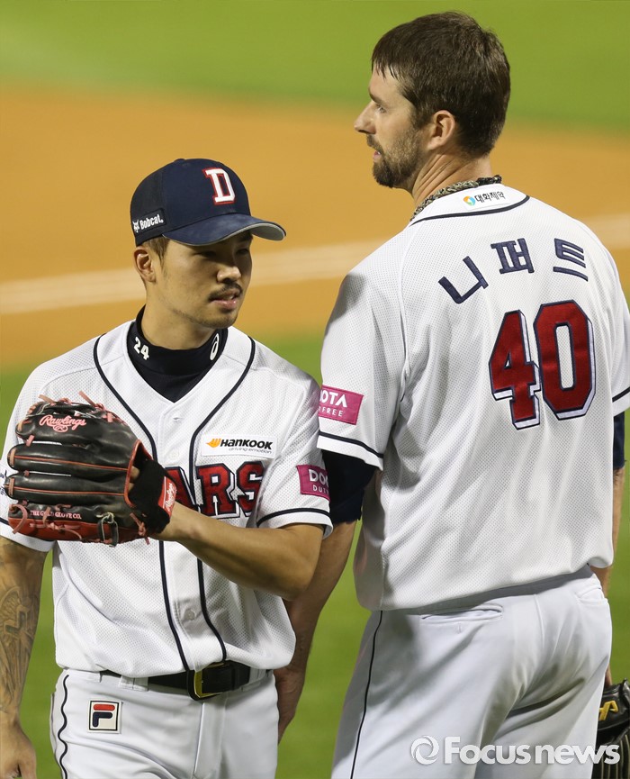 (서울=포커스뉴스) 12일 서울 잠실구장에서 열린 2016 프로야구 kt-두산 경기에서 두산 투수 니퍼트가 6회 수비를 마치고 공수교대하며 2루수 오재원을 맞이하고 있다.