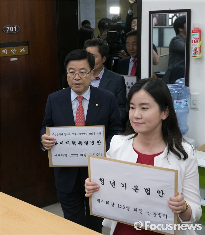 이날 현장방문은 새누리당의 청년일자리 대책 발표와 연계돼 계획됐는데, 김희옥 비대위원장을 비롯한 비대위원들이 국내외 청년창업 관련 기업가 및 투자자 등과 함께 간담회·토론회를 가질 예정이다.20대 국회 임기가 시작된 30일 오후 서울 여의도 국회 의안과에서 김광림(오른쪽 두번째) 새누리당 정책위의장, 신보라(오른쪽 첫번째) 청년소통특위 부위원장 등 의원들이 당론 1호법안인 청년기본법과 규제프리존법, 서비스법 등 9개 법안 서류를 제출하고 있다. 2016.05.30 박동욱 기자