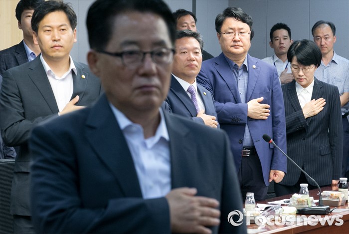 (서울=포커스뉴스) 22일 오전 서울 여의도 국회 의원회관에서 열린 국민의당 18차 정책역량강화 워크숍에 참석한 박지원(왼쪽 두번째) 원내대표와 박선숙(오른쪽 첫번째) 의원 등이 국기에 대한 경례를 하고 있다.