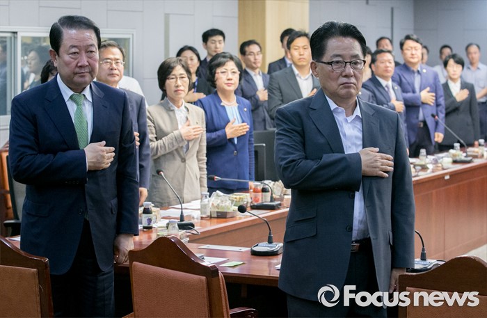 (서울=포커스뉴스) 22일 오전 서울 여의도 국회 의원회관에서 열린 국민의당 18차 정책역량강화 워크숍에 참석한 박주선(왼쪽) 국회 부의장과 박지원 원내대표 등 의원들이 국기에 대한 경례를 하고 있다.