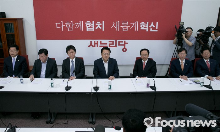 (서울=포커스뉴스) 22일 오전 서울 여의도 국회에서 열린 새누리당 신공항 관련 5개 시도 중진의원 간담회에 참석한 정진석 원내대표 등 의원들이 최정호 국토교통부 2차관의 현안보고를 받고 있다. 왼쪽부터 김광림 정책위의장, 최경환, 유승민 의원, 정 원내대표, 이주영, 조경태, 강길부 의원.