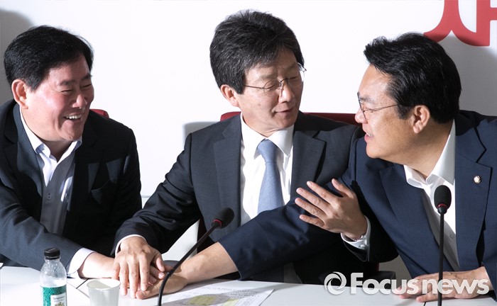 (서울=포커스뉴스) 22일 오전 서울 여의도 국회에서 열린 새누리당 신공항 관련 5개 시도 중진의원 간담회에 참석한 정진석(오른쪽부터) 원내대표, 유승민, 최경환 의원이 민경욱 원내대변인의 제안으로 손을 맞잡고 있다.