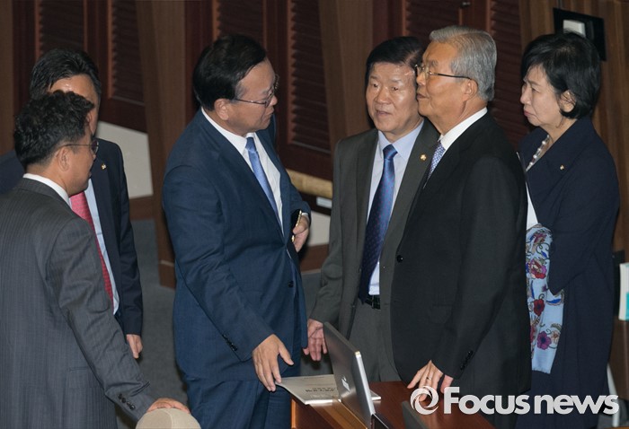 (서울=포커스뉴스) 22일 오전 서울 여의도 국회에서 열린 343회 국회(임시회) 5차 본회의에 참석한 김종인 더불어민주당 비대위 대표, 김부겸, 박병석, 손혜원 의원 등이 대화하고 있다.