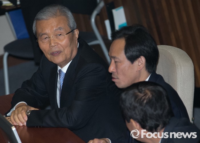 (서울=포커스뉴스) 22일 오전 서울 여의도 국회에서 열린 343회 국회(임시회) 5차 본회의에 참석한 김종인 더불어민주당 비대위 대표, 우상호 원내대표 등 의원들이 대화하고 있다.