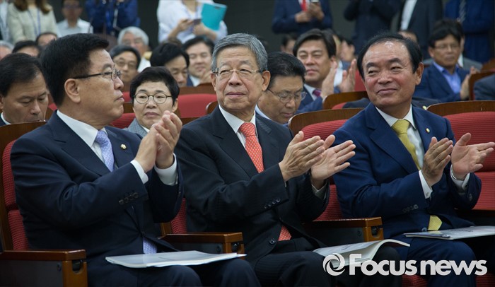 (서울=포커스뉴스) 김광림(왼쪽부터) 새누리당 정책위의장, 김희옥 혁신비상대책위원장, 장병완 국민의당 의원이 22일 오전 서울 여의도 국회 의원회관에서 열린 경제재정연구포럼 토론회에서 박수를 치고 있다.