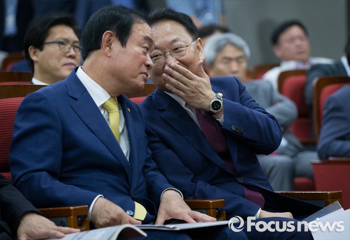 | △ 귀엣말하는 유일호와 장병완 |