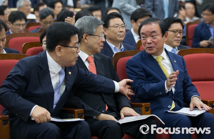(서울=포커스뉴스) 김광림(왼쪽부터) 새누리당 정책위의장, 김희옥 혁신비상대책위원장, 장병완 국민의당 의원이 22일 오전 서울 여의도 국회 의원회관에서 열린 경제재정연구포럼 토론회에서 대화하고 있다.