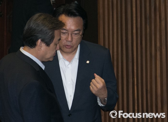 (서울=포커스뉴스) 22일 오전 서울 여의도 국회에서 열린 343회 국회(임시회) 5차 본회의에 참석한 정진석(오른쪽) 새누리당 원내대표와 김무성 전 대표가 대화하고 있다.
