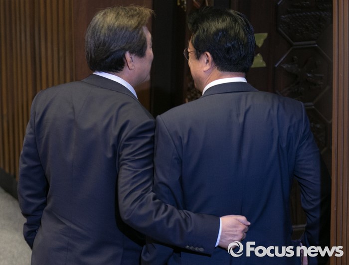 (서울=포커스뉴스) 22일 오전 서울 여의도 국회에서 열린 343회 국회(임시회) 5차 본회의에 참석한 정진석(오른쪽) 새누리당 원내대표와 김무성 전 대표가 대화한 뒤 함께 퇴장하고 있다.
