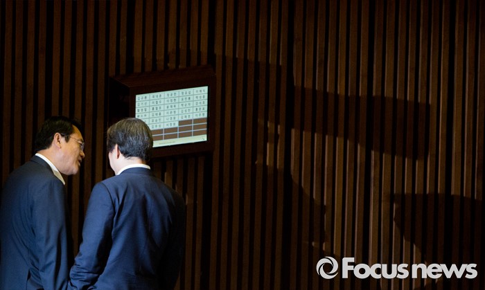 (서울=포커스뉴스) 정진석 새누리당 원내대표와 김무성 새누리당 전 대표가 22일 오전 서울 여의도 국회에서 열린 본회의에 참석해 대화 하고 있다.