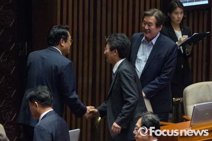 (서울=포커스뉴스) 정진석 새누리당 원내대표와 유승민 새누리당 의원이 22일 오전 서울 여의도 국회에서 열린 본회의에 참석해 대화 하고 있다.
