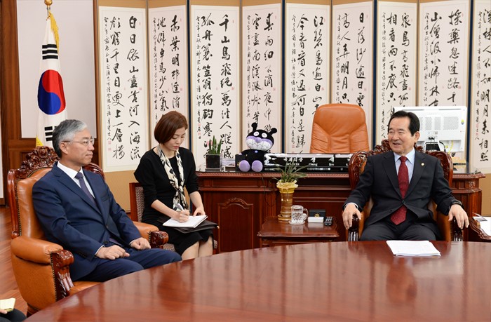 (서울=포커스뉴스) 정세균(오른쪽) 국회의장이 22일 오전 서울 여의도 국회를 방문한 추궈홍 주한중국대사와 면담을 하고 있다. <사진제공=국회>
