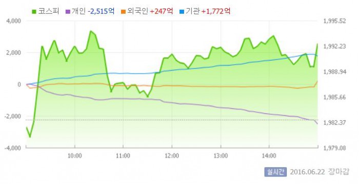 증시 전문가들은 "코스피가 기관의 강한 순매수에 힘입어 1990선을 회복했다"면서 "브렉시트(영국의 유럽연합 탈퇴)투표 결과가 잔류로 결정될 경우, 리스크 완화라는 호재로 강세장이 펼쳐질 전망"이라고 관측했다.