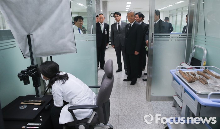 (서울=포커스뉴스) 김종인 더불어민주당 비대위 대표와 의원들이 22일 오후 서울 동작구 국립서울현충원 내 국방부 유해발굴감식단 중앙감식소를 방문해 시설을 둘러보고 있다.