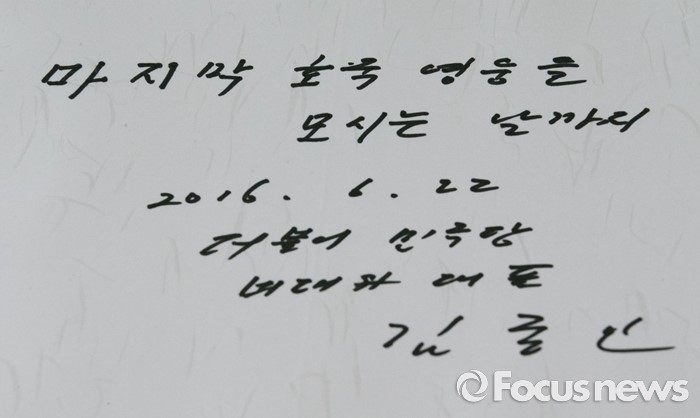 (서울=포커스뉴스) 김종인 더불어민주당 비대위 대표가 22일 오후 서울 동작구 국립서울현충원 내 국방부 유해발굴감식단을 방문해 방명록을 작성했다. 사진은 김 대표가 남긴 글귀.