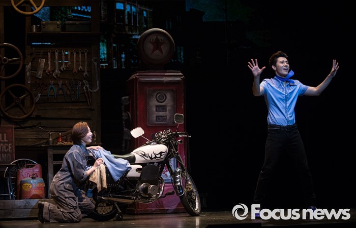 (서울=포커스뉴스) 22일 오후 서울 종로구 홍익대학고 대학로 아트센터에서 열린 뮤지컬 '올슉업' 프레스콜에 참여한 배우 제이민(왼쪽)과 김성규가 주요장면을 시연하고 있다.