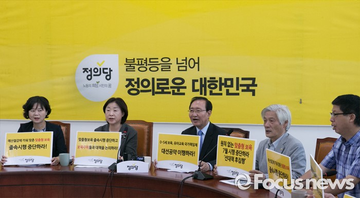 (서울=포커스뉴스) 심상정 정의당 상임대표와 노회찬 원내대표 등 의원 및 당직자들이 23일 오전 서울 여의도 국회에서 상무위원회에 앞서 정부 맞춤형 보육 시행반대 피켓 퍼포먼스를 하고 있다.