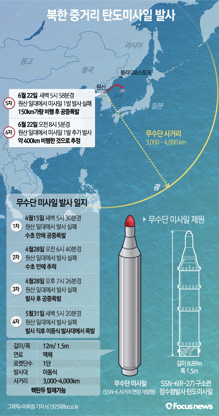 북한은 22일 오전 무수단 미사일로 추정되는 발사체를 2발 발사했다. 이중 두 번째 무수단은 400km를 비행한 뒤 동해 상에 떨어진 것으로 알려졌다.