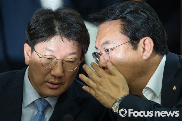 (서울=포커스뉴스) 정진석(오른쪽) 새누리당 원내대표와 권성동 사무총장이 23일 오전 서울 여의도 새누리당 당사에서 열린 혁신비상대책위원회 회의에서 대화하고 있다.