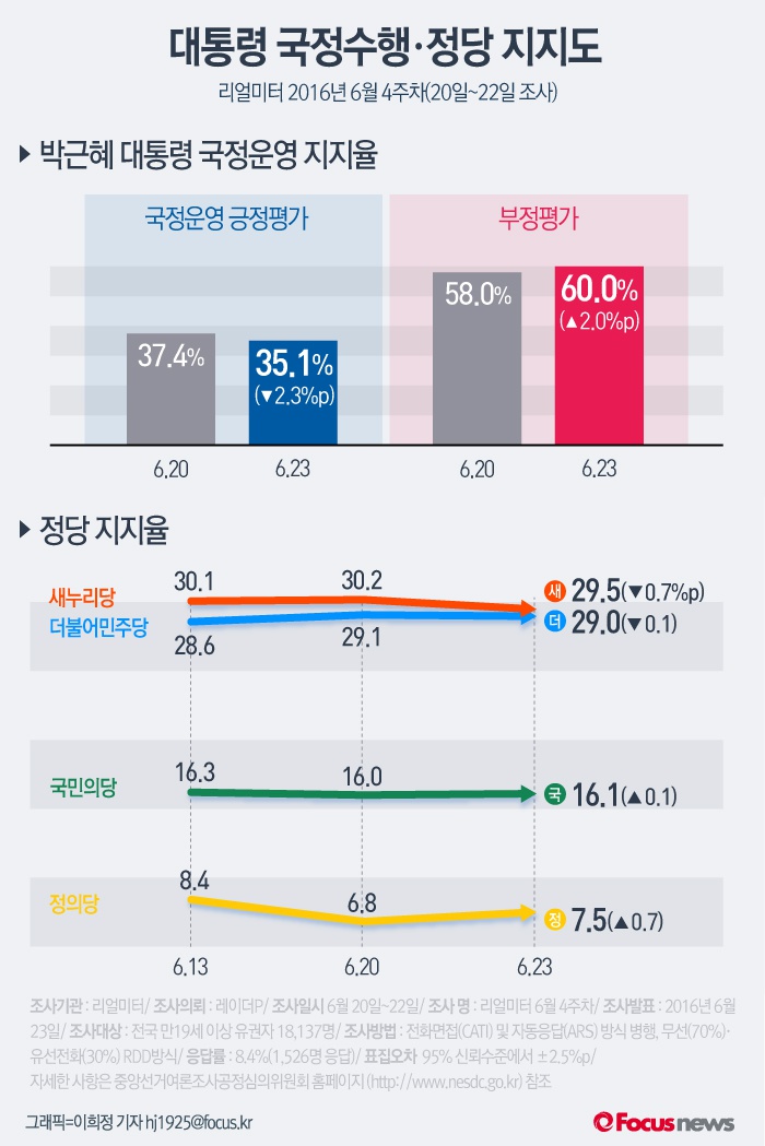 (서울=포커스뉴스) 여론조사 기관 리얼미터의 2016년 6월 4주차 주중동향에 따르면 박근혜 대통령의 국정수행 지지율은 지난주보다 하락한 반면 부정평가는 지난주보다 2.0%p 상승해 60.0%로 나타났다.