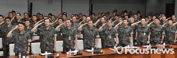 (서울=포커스뉴스) 북한이 무수단급 중거리 탄도미사일을 발사한 다음날인 23일 오전 서울 용산구 국방부 대회의실에서 열린 '2016년 전반기 전군 주요지휘관 회의'에 참석한 전군 지휘관들이 국민의례를 하고 있다.