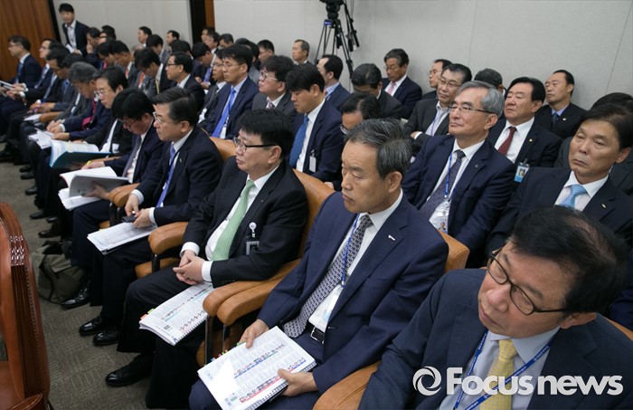 (서울=포커스뉴스) 23일 오전 서울 여의도 국회에서 열린 산업통상자원위원회 전체회의에 참석한 산업통상자원부 산하 기관장들이 자리하고 있다.