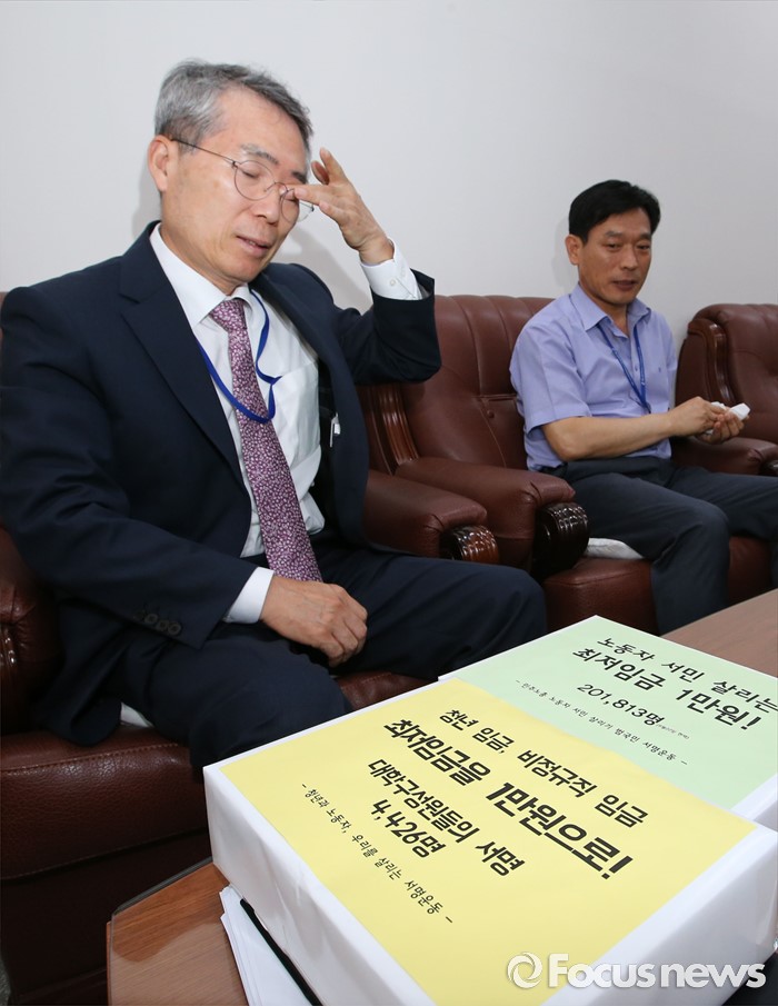 (세종=포커스뉴스) 박준성 최저임금위원회 위원장이 23일 오후 세종시 정부세종청사 고용노동부 최저임금위원장실에서 최종진 민주노총 위원장 직무대행과 관계자들로부터 최저임금 1만원 서명지를 받고 있다.