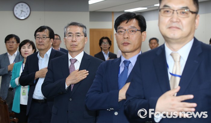 (세종=포커스뉴스) 박준성 최저임금위원회 위원장괴 위원들이 23일 오후 세종시 정부세종청사 고용노동부 최저임금위원회 전원회의실에서 열린 5차 전원회의에 앞서 국기에 대한 경례를 하고 있다.