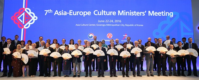 (광주=포커스뉴스) 제7차 ASEM 문화장관회의 개회식이 열린 23일 광주 동구 국립아시아문화전당 국제회의장에서 황교안 국무총리와 김종덕 문화체육관광부 장관이 아시아와 유럽의 문화부 장차관들과 함께 ‘문화와 창조경제’라고 적힌 부채를 들고 기념촬영을 하고 있다. <사진제공=문화체육관광부>