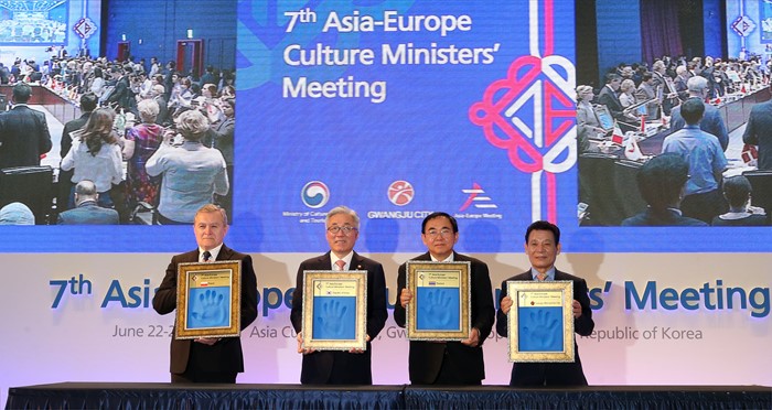 (광주=포커스뉴스) 김종덕 문화체육관광부 장관이 23일 광주 동구 국립아시아문화전당 국제회의장에서 열린 제7차 ASEM 문화장관회의 개회식에서 아시아와 유럽의 문화부 장차관들과 함께 핸드프린팅을 마치고 액자를 들어 보이고 있다. <사진제공=문화체육관광부>